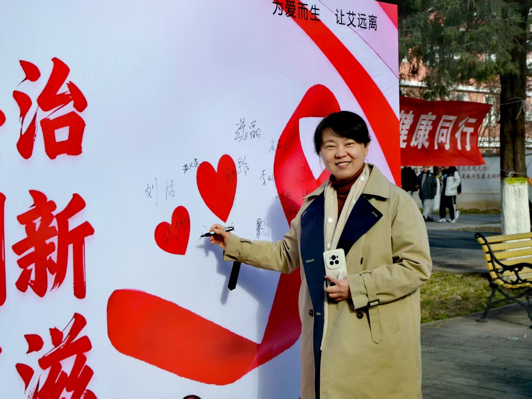 本次活动是学校健康育人工作的重要一环,以灵活多样的互动形式打造沉浸式防艾科普体验,有效破解知识传播难点。在互动游戏区,拼图块与题卡上的“传播途径”“预防措施”等知识点,让师生在动手动脑中深化对防艾知识的理解;防艾签名墙前,武艳率先提笔签名,带动师生纷纷写下姓名,以签名承诺传递“反对歧视、关爱患者”的校园正能量。此外,图文并茂的宣传展板成为师生快速学习的“移动课堂”,互动问答与资料发放环节同步推进,志愿者为参与者答疑解惑并赠送宣传手册,实现防艾知识的精准传递。