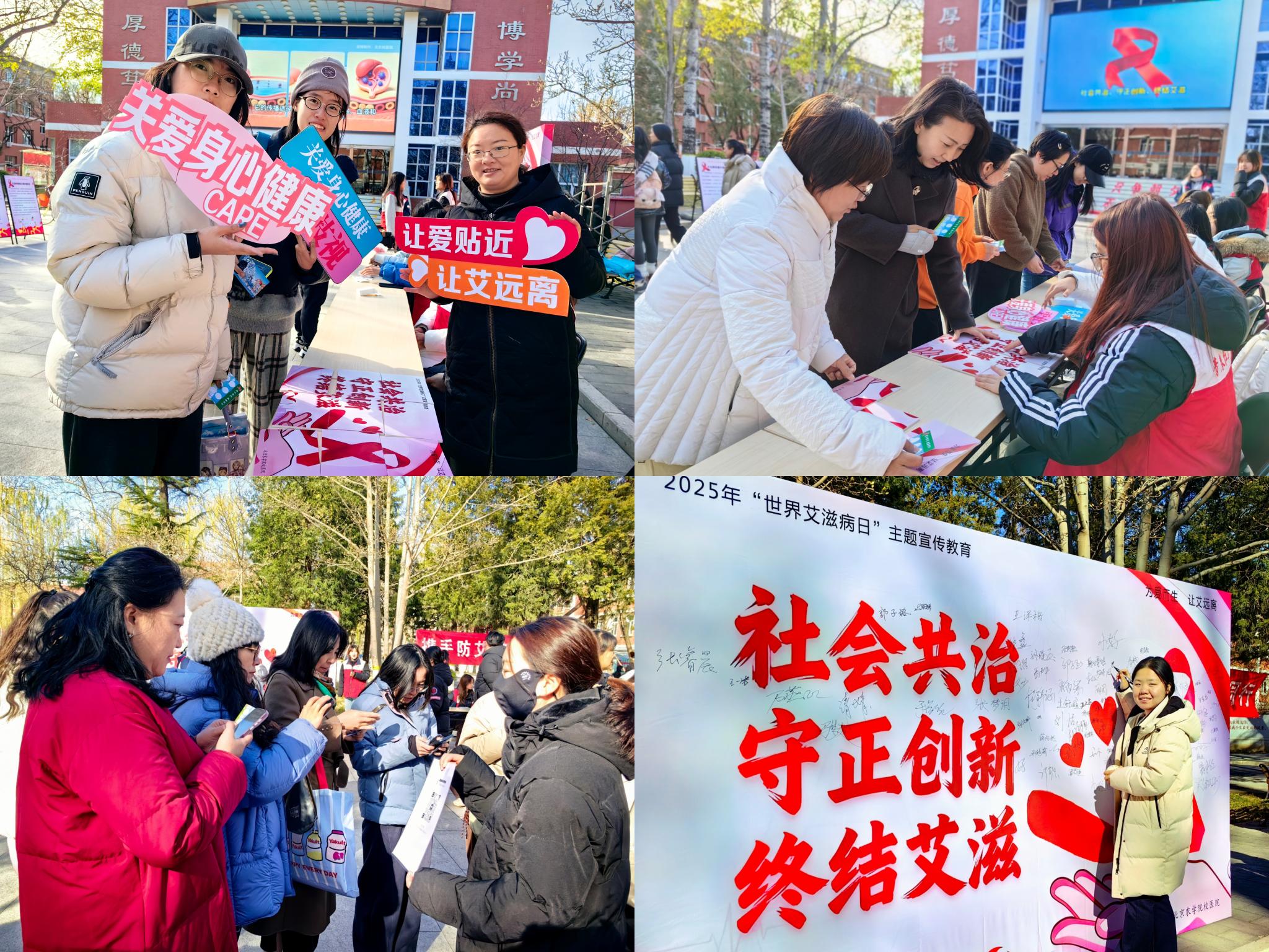 2025年12月1日,我们迎来第 38 个“世界艾滋病日”。当日,北京农学院校医院联合校红十字会社团,紧扣“社会共治,守正创新,终结艾滋”的宣传主题,在大礼堂东门前空地举办防艾宣传活动。党委常委、副院长武艳亲临现场参与互动,与全校师生共同学习防艾知识,以实际行动推动校园防艾教育走深走实。