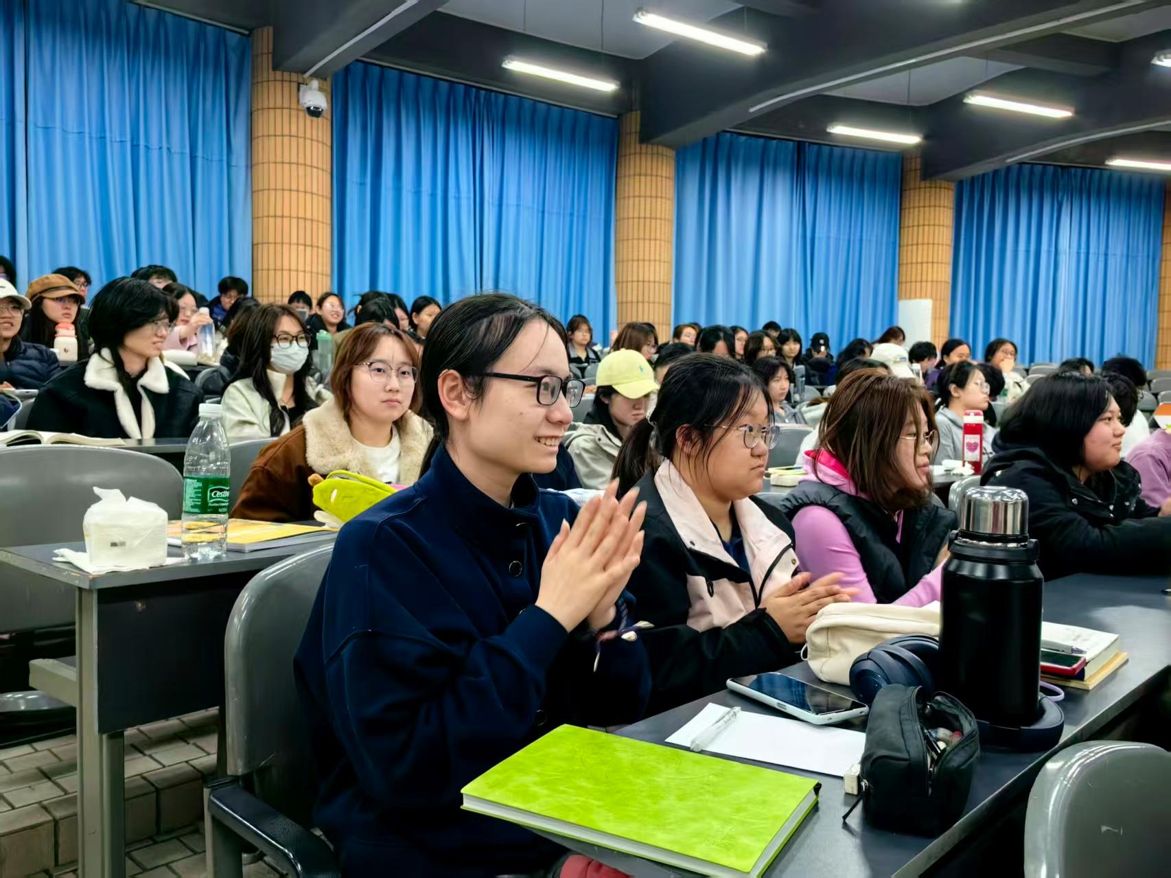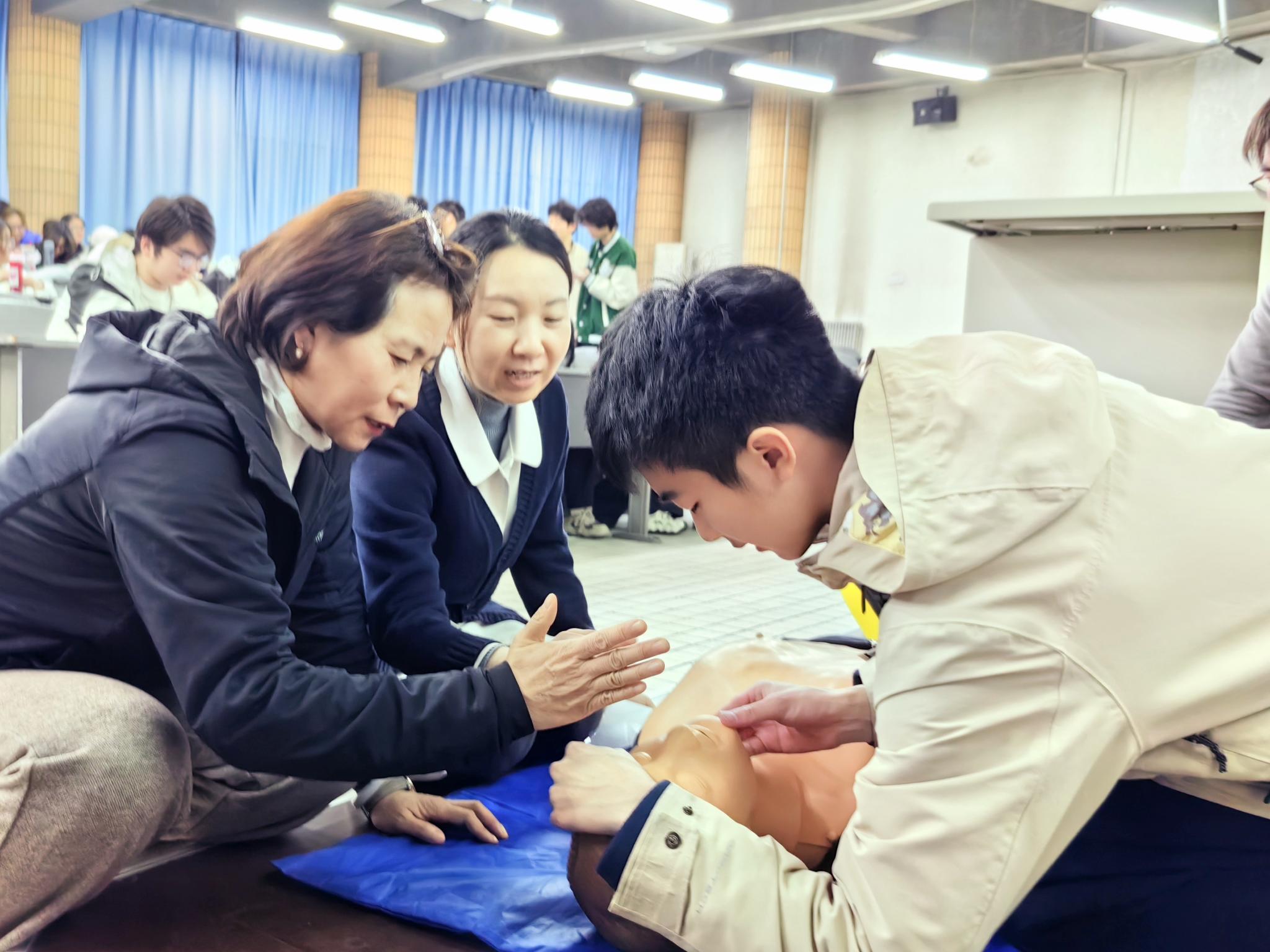 校医院护士长聂晶围绕心肺复苏(CPR)与AED使用开展教学,强调黄金救援时间,拆解操作要点。同学们在医护人员指导下现场实操演练,熟练掌握急救技能。
